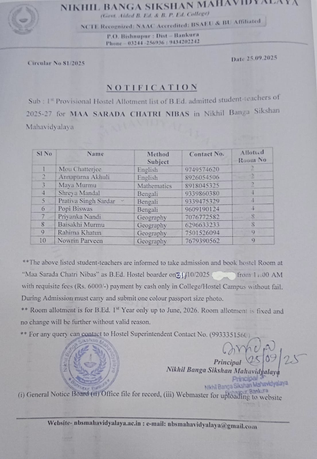 Nikhil Banga Sikshan Mahavidyalaya started its journey from 22.09.1969 which a unique example of 'Self help' materialized by the Bankura district unit of All Bengal Teachers' Association (A.B.T.A). The Institution earned its affiliation from The University and recognized by UGC by the UGC u/s 2(f) from its inception vide letter no. 13-2/71(CD) dated 31.03.1971 and also considered eligible to receive central assistance through UGC u/s 12(B). At the beginning the Institution was eligible to run only B. Ed. course (formerly B.T.)