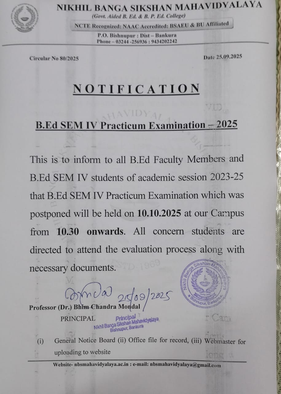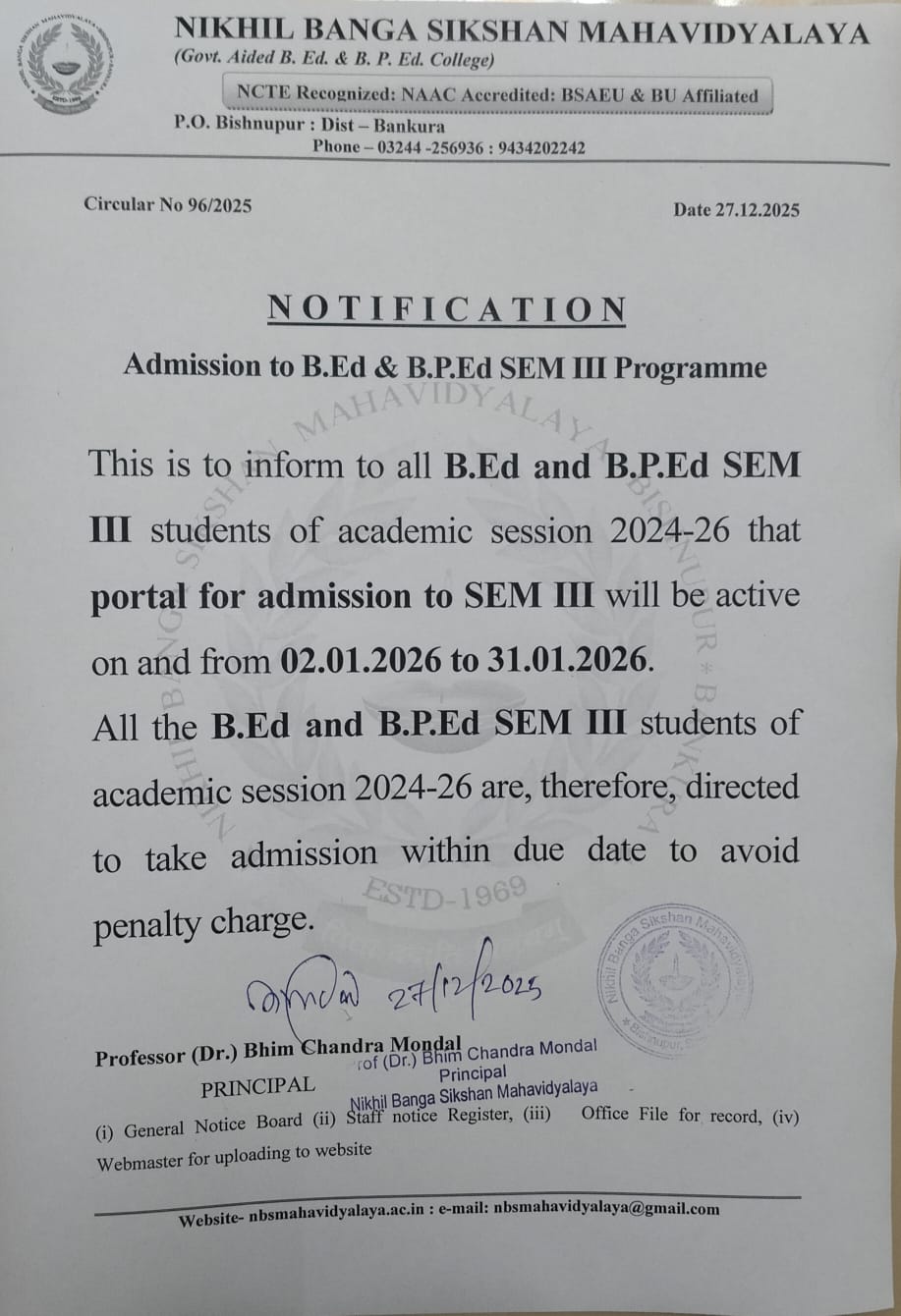 Admission to Sem III to both B.Ed & B.P.Ed Department.