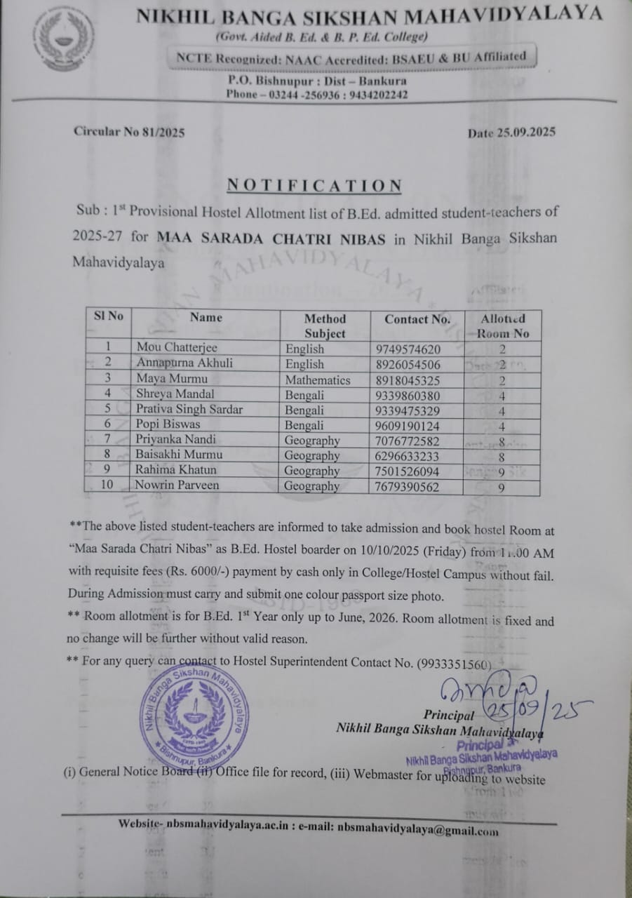 Hostel Allotment List ( Maa Sarada Chatri Nibas )