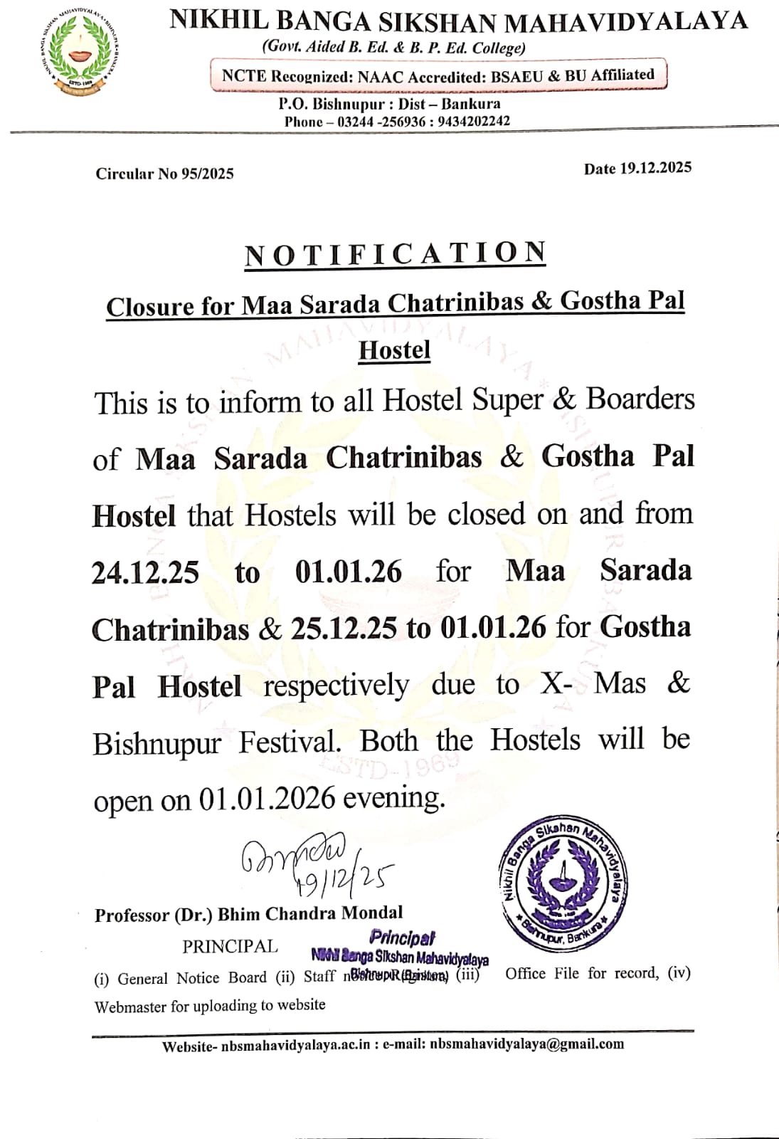 Closure for Maa Sarada Chatrinibas & Gostho Pal Hostel